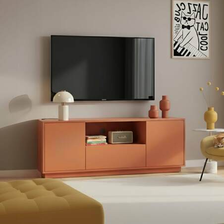 Le meuble TV uni "RUBEN" allie un design contemporain à une grande fonctionnalité. Avec ses dimensions de 140 cm de longueur, 40 cm de largeur et 52 cm de hauteur, il s’intègre parfaitement dans un salon pour optimiser votre espace de rangement. Fabriqué en MDF recouvert de mélamine, il offre une surface robuste et facile d’entretien. Conçu avec des matériaux certifiés FSC mix à 90 %, il respecte l’environnement. Ses trois portes s’ouvrent grâce à un mécanisme Push-open sans poignée, assurant une utilisation fluide tout en conservant une esthétique épurée et minimaliste.