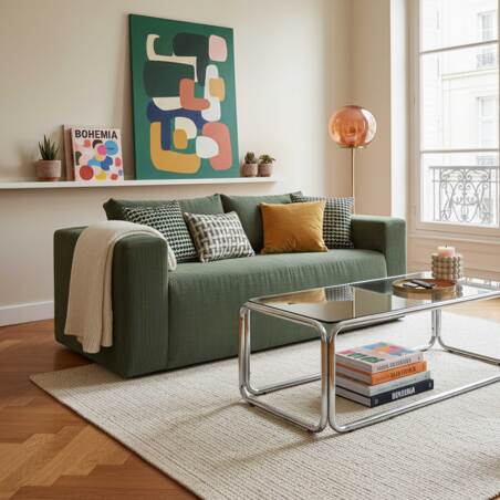 Le canapé 2 places CLAY en tissu côtelé combine harmonieusement confort et esthétique grâce à ses dimensions de 160 x 87,5 x 72 cm. Son rembourrage se compose d’une mousse polyuréthane haute résilience (32 kg/m³) associée à des ressorts ensachés, garantissant un soutien optimal ainsi qu’une grande longévité, tandis que sa base antidérapante assure une stabilité irréprochable. Le cadre, l’assise et le dossier sont également garnis d’une mousse dense de 32 kg/m³ pour un confort uniforme. Le revêtement en tissu côtelé 100 % polyester (220 g/m²) confère une texture à la fois élégante et chaleureuse, procurant une sensation structurée mais douce au toucher. Les coussins, dont les housses sont amovibles et lavables, facilitent l’entretien. Avec une hauteur d’assise de 41 cm, une profondeur de 65,5 cm, une hauteur d’accoudoirs de 56 cm et une largeur sans accoudoirs de 112,5 cm, ce canapé offre un espace agréable pour deux personnes, alliant design moderne et praticité.