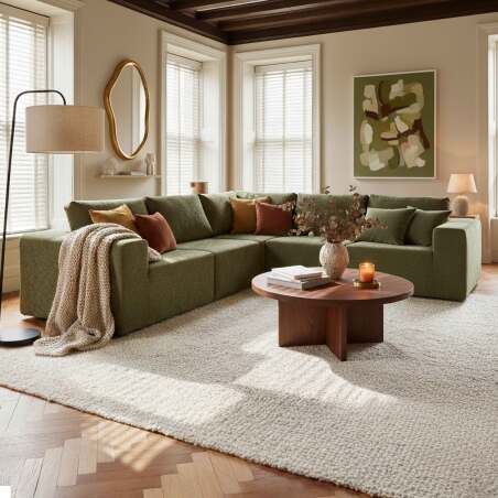 Le canapé modulable d'angle 5 places en tissu HECTOR est un ensemble modulable composé de deux modules centraux, un module gauche, un module droit et un module d’angle, offrant une grande flexibilité d’aménagement. Conçu en tissu 100% polyester certifié Oeko-Tex, il allie confort et durabilité avec une hauteur d’assise de 40 cm, un dossier de 56 cm sans coussin et 78 cm avec coussin pour un soutien optimal. Les mousses haute densité de 32 kg/m³ utilisées pour le cadre, l’assise et le dossier garantissent un confort ferme et durable. Avec des dimensions généreuses de 275 x 275 x 78 cm, ce canapé spacieux et élégant s’adapte parfaitement à votre espace de vie tout en offrant cinq places confortables.