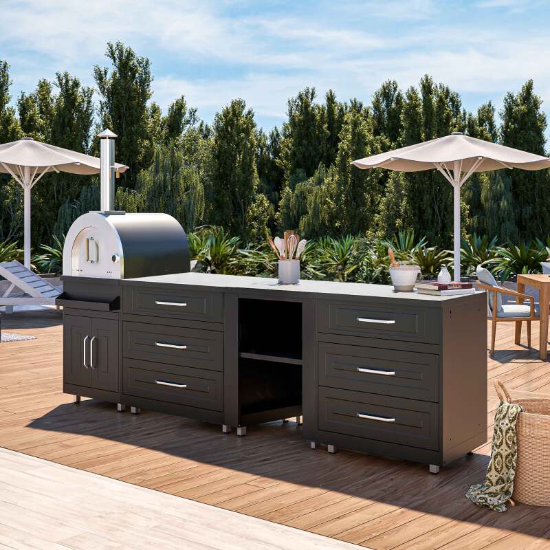 Découvrez notre cuisine d'extérieur au style industriel, parfaitement équipée pour les passionnés de cuisine en plein air, notamment avec son four à pizza exceptionnel. Doté d'une surface de cuisson spacieuse de 60 x 53 cm, ce four est fabriqué en pierre de cordiérite minérale naturelle, garantissant une excellente répartition de la chaleur et une durabilité à toute épreuve. Avec une épaisseur de brique réfractaire de 15 mm, il est conçu pour cuire des pizzas de manière optimale. Pensez à utiliser du bois dur et sec, comme le chêne, et évitez les résineux pour un résultat parfait. La conception pratique de cette cuisine comprend une partie basse équipée de deux portes à fermeture amortie, pour un accès facile à votre équipement. Sur le devant, un bac à saveurs vient ajouter une touche d'originalité, tandis qu'une pochette en acier et quatre crochets permettent de suspendre torchons, gants ou accessoires, facilitant ainsi votre expérience culinaire. En matière de rangement, vous trouverez deux meubles supplémentaires dotés de trois tiroirs avec glissières à fermeture amortie, offrant un espace idéal pour organiser vos ustensiles et ingrédients. Un meuble de rangement central, avec un plan de travail spacieux et une étagère, constitue l'endroit parfait pour préparer vos plats tout en gardant vos ingrédients à portée de main. Enfin, cette cuisine est équipée de pieds réglables, vous permettant de l'adapter facilement à des sols irréguliers pour garantir une stabilité lors de son utilisation.