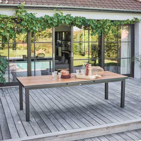 Table de jardin extensible en aluminium 256/320x100 cm et 10 chaises avec accoudoirs en textilène