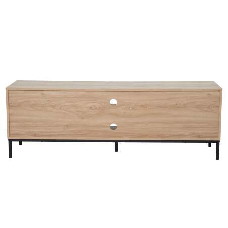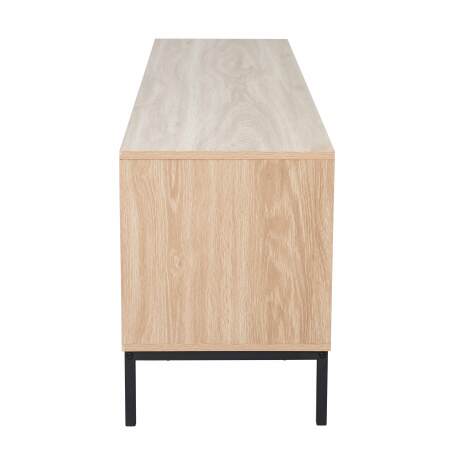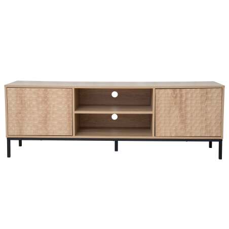 Ce meuble TV KETRY au design contemporain présente des dimensions de 160 cm de longueur, 40 cm de profondeur et 54 cm de hauteur, et est équipé de deux portes. Il peut supporter un poids total maximal de 50 kg, avec des étagères capables de contenir jusqu’à 8 kg chacune. Son système d’ouverture repose sur le système Push-up. Le plateau supérieur est fabriqué en panneau MDF recouvert d’une couche de mélamine, tandis que les portes sont constituées d’un film rétractable en PVC orné de motifs sculptés en relief 3D. La structure est conçue en tubes métalliques peints avec une finition électroluminescente noire, intégrant également des éléments en eucalyptus qui assurent à la fois élégance et solidité.