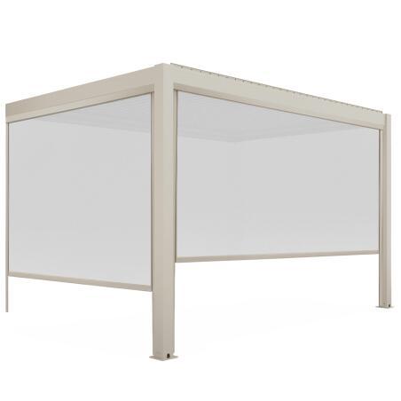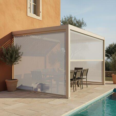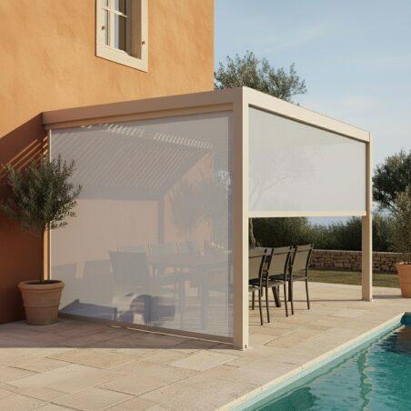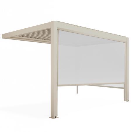 Découvrez la pergola bioclimatique OIA 3x4m couleur crème, présentée en un seul pavé, un ajout à la fois élégant et fonctionnel qui s’intègre parfaitement à votre façade, créant un prolongement ombragé et harmonieux de votre espace de vie extérieur. Cette installation optimise l'espace disponible de manière unique, offrant les avantages d'une véranda et d'une pergola autoportée sans compromis sur la surface. Équipée de stores SPARTE pour une occultation à 95%, elle assure une protection solaire efficace et une excellente isolation, garantissant une fraîcheur agréable à l'intérieur comme à l'extérieur. Les lames ajustables jusqu'à 90° permettent une gestion optimale de l'ombre, tandis que sa fabrication entièrement en aluminium lui confère une résistance remarquable aux intempéries. Son design épuré et moderne, rehaussé par sa finition crème, s'harmonise avec tout décor extérieur, ajoutant une touche de raffinement.