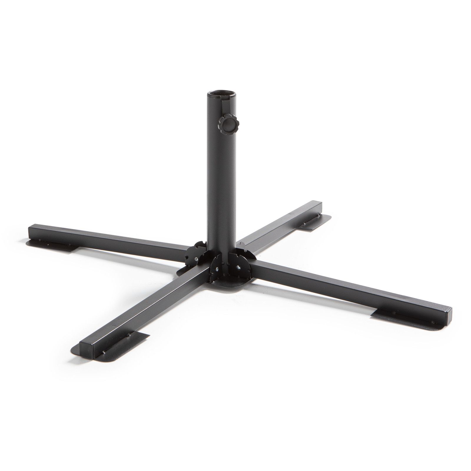 Un seul moyen pour stabiliser parfaitement votre parasol de jardin, droit ou déporté : le pied de parasol pliant à 4 branches ! Ultra solide avec sa composition en acier renforcé, c'est le support qu'il vous faut. L'avantage de ce pied pour parasol ? Les 4 branches se replient pour un encombrement minimum, il est donc facile à stocker lorsque vous ne l'utilisez plus durant l'hiver. Installation sans outils. Pensez également à bien fixer votre parasol avec 2 à 4 dalles de lestage adaptées.