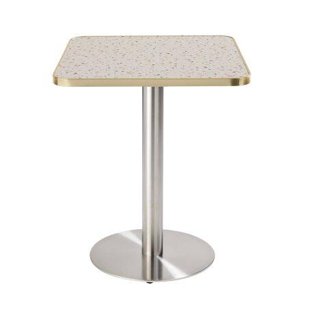 Découvrez cette table à manger compacte de 60 x 60 cm pour 2 personnes, fabriquée en contreplaqué avec un revêtement stratifié et des bords en aluminium. Elle est dotée d'un cadre en aluminium et d'une colonne en acier inoxydable de Ø 7,6 cm, offrant une excellente stabilité. Le plateau supérieur en acier mesure 30 x 30 cm, parfait pour des repas conviviaux. Sa base en acier de Ø 45 cm garantit un bon appui, tandis que les cinq embouts de pied noirs réglables permettent d’adapter la table à tous les types de sols. Pratique et élégante, elle s'intègre facilement dans tous les intérieurs.