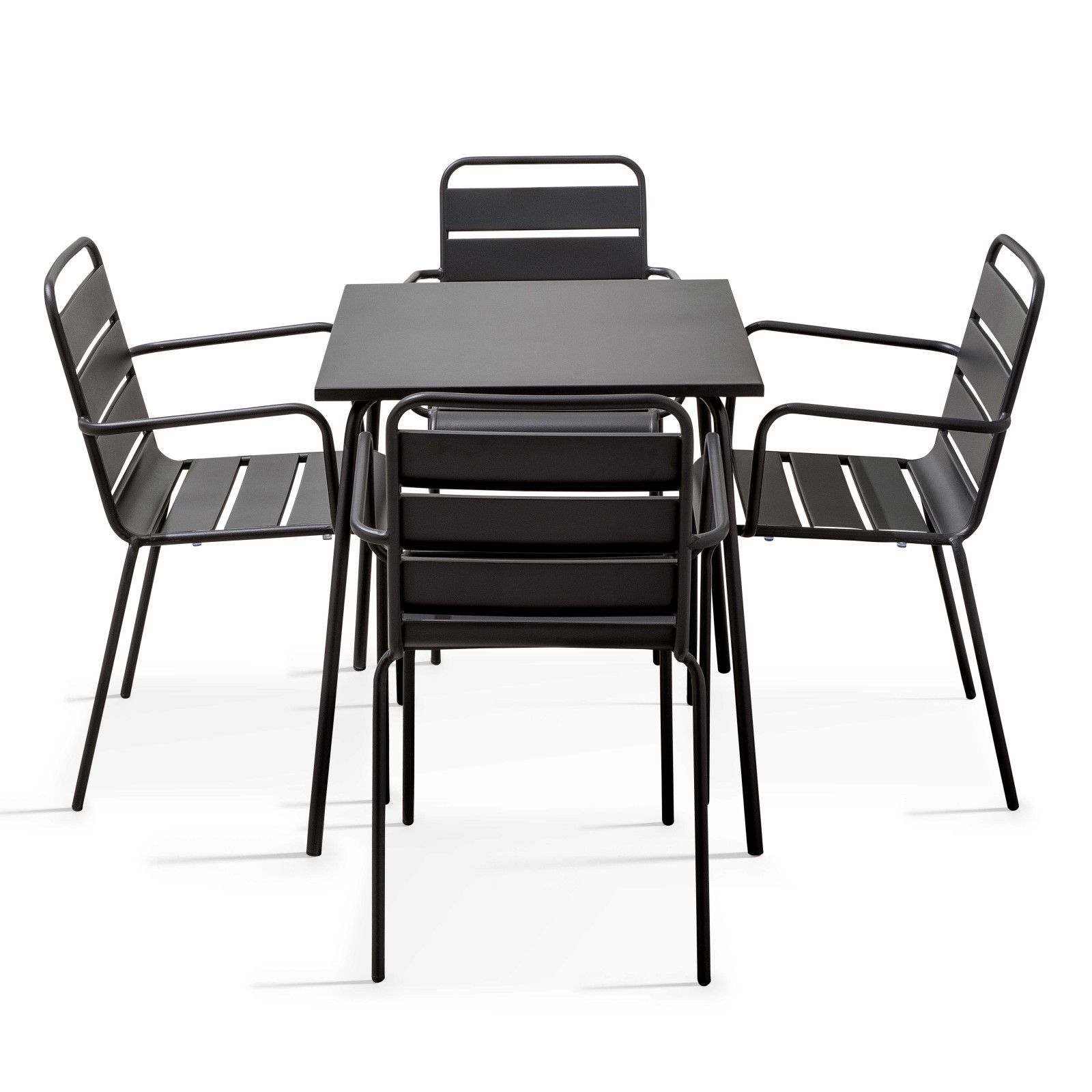 Cet ensemble de salon de jardin en métal PALAVAS se compose d’une table de jardin carrée et de 4 chaises avec accoudoirs empilables en acier thermolaqué. Ses couleurs tendance et ses lignes modernes en font un atout déco pour votre extérieur. Bien stables, aux finitions soignées, la table de jardin et les chaises avec accoudoirs PALAVAS sont réalisées en acier thermolaqué finition époxy, matériau à l’épreuve des intempéries et sont traitées anticorrosion. Robustes, ils conviennent à un usage quotidien en extérieur. Les chaises avec accoudoirs de cet ensemble constituées de lattes juxtaposées pour éviter la stagnation de l'eau de pluie et au piètement légèrement incliné vous invitent à prendre place confortablement.