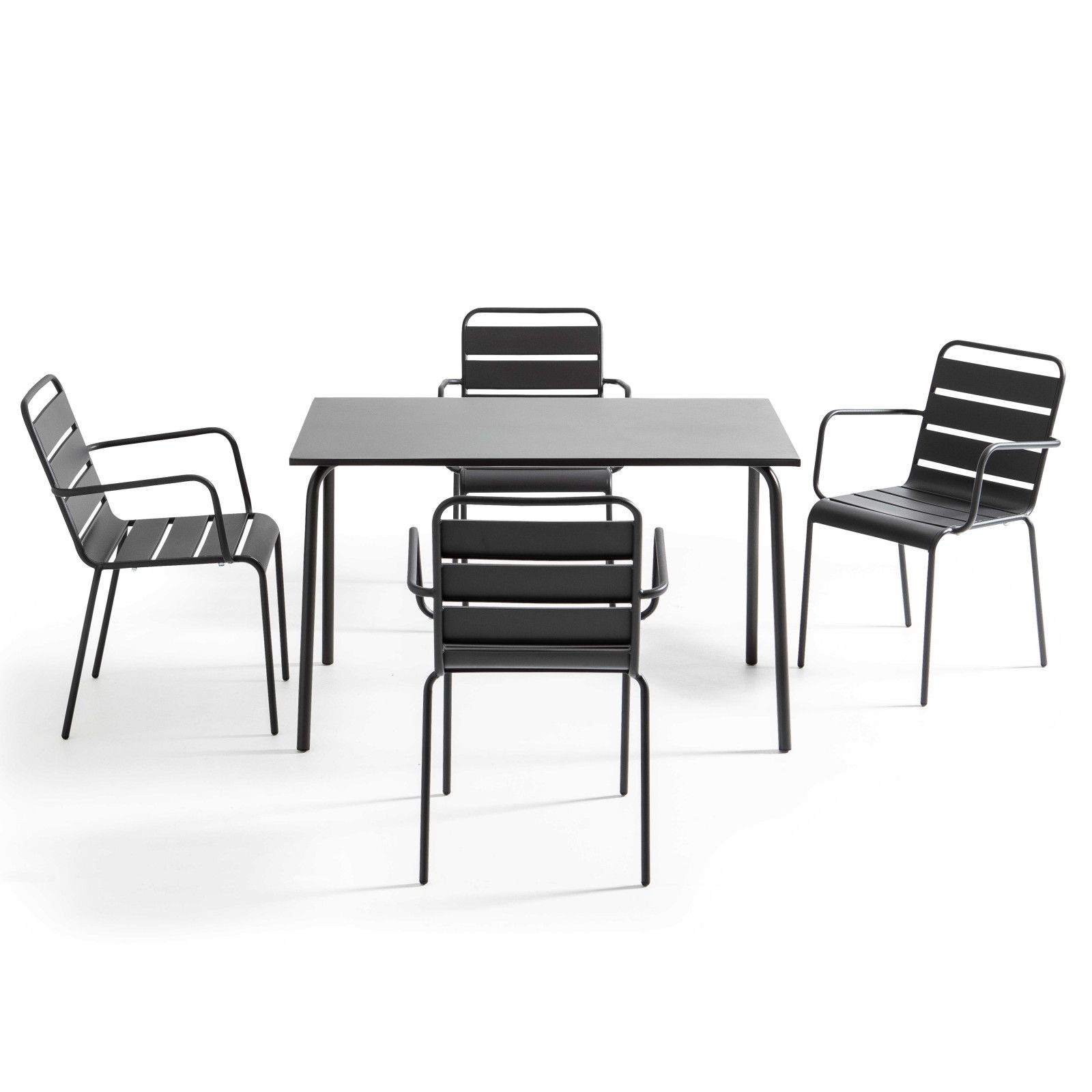 Un salon de jardin en métal, au design efficace qui marque les esprits ! Le salon de jardin PALAVAS est un véritable classique, revisité avec des caractéristiques minimalistes, conçu en acier thermolaqué. Avec son design épuré, ce salon de jardin ne manque pas de style. Il s’intègre aussi bien dans une ambiance contemporaine que plus traditionnelle et se plaît même en intérieur. La table de jardin en métal accompagnée de ses 4 chaises de jardin avec accoudoirs sont conçues pour durer. L’acier thermolaqué résiste bien aux chocs, à la corrosion et aux agressions des éléments extérieurs comme les rayons du soleil ou l’humidité. On aime ce style un brin rétro qui n’a pas oublié d’être pratique. Les 4 chaises de jardin en métal, conçues avec des accoudoirs, sont confortables et empilables pour un gain de place appréciable lorsque l’espace est restreint. Le dossier est incliné juste comme il faut, l’assise est large et profonde, les accoudoirs favorisent la détente. Un salon de jardin sans chichi qui invite à la convivialité et à l’authenticité. Ce salon de jardin en métal se décline dans des coloris qui aspirent à la joie de vivre et à la légèreté. Ça sent bon l’été ! L’entretien de ce salon de jardin se limite à passer une éponge ou un chiffon doux avec un peu d’eau.