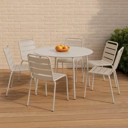 Salon de jardin en métal avec une grande table ronde et 6 chaises. Le salon de jardin 6 personnes de la gamme Palavas présente un style à la fois simple et convivial pour des repas chaleureux en plein air. Avec leur design aussi sobre qu'élégant, la table de jardin et ses 6 chaises en métal apportent une touche déco très tendance à votre terrasse ou jardin. Le salon de jardin 6 places Palavas bénéficie d'une conception 100% acier et ultra-robuste. Protégés par un traitement à la peinture époxy, la table ronde en acier et les 6 chaises de jardins ne craignent ni intempéries ni rayons ultraviolets. Le salon de jardin peut être utilisé en extérieur à toute période de l'année et est très facile d'entretien. Afin d'économiser l'espace lors du rangement, les chaises en acier sont empilables. Leur assise ajourée permet également d'évacuer naturellement les eaux de pluie. Seuls les pieds de la table de jardin en acier sont à monter, la notice et les outils sont fournis. Le salon de jardin table et chaises de jardin en métal est garanti 2 ans.