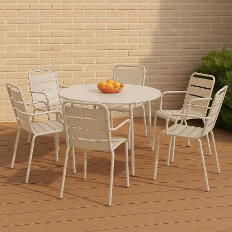 La table de jardin ronde Ø120 x 72 cm avec ses 6 chaises empilables constitue un ensemble parfait pour profiter pleinement de votre espace extérieur. Dotée d'une conception en métal thermolaqué avec une finition époxy traitée anti-UV, cette table et ces chaises offrent une durabilité exceptionnelle et une protection contre les intempéries. La table de jardin ronde a un diamètre de 120 cm et une hauteur de 72 cm, offrant un espace généreux pour accueillir vos repas en plein air, vos réunions familiales ou vos moments de détente entre amis. Son design demeure classique et élégant, s'adaptant parfaitement à tous les styles de jardin. Le piètement légèrement incliné confère à cette table de jardin une stabilité supplémentaire, même sur des terrains irréguliers. Vous pourrez ainsi profiter de vos repas en toute tranquillité, sans avoir à vous soucier de la stabilité de la table. Les 6 chaises empilables avec accoudoirs complètent parfaitement cette table de jardin. Leur construction en métal thermolaqué assure une résistance aux intempéries et une longévité accrues. De plus, leur design ergonomique avec des accoudoirs offrira un confort optimal à vos invités lors de repas prolongés en plein air. Grâce à leur capacité d'empilage, les chaises prennent un minimum d'espace lorsqu'elles ne sont pas utilisées, vous permettant de les ranger facilement et de les transporter avec facilité. En somme, avec sa table de jardin ronde Ø120 x 72 cm et ses 6 chaises empilables avec accoudoirs en métal thermolaqué, cet ensemble offre à la fois style, durabilité et praticité pour créer un espace extérieur accueillant et convivial. Profitez de vos repas en plein air tout en ajoutant une touche d'élégance à votre jardin grâce à une table extérieure ronde.